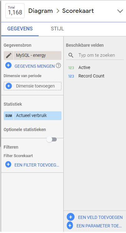 - Voor de scoreboard ‘Actueel verbruik’ heb ik de volgende MySQL verbinding gedefinieerd: