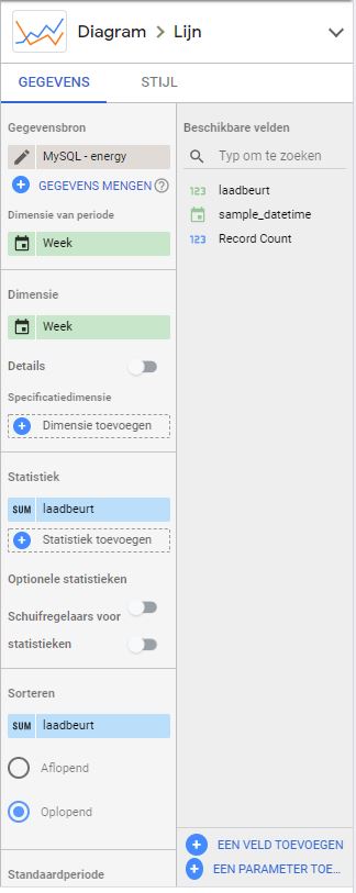 - Voor de lijndiagram ‘Laadbeurten’ heb ik de volgende MySQL verbinding gedefinieerd: