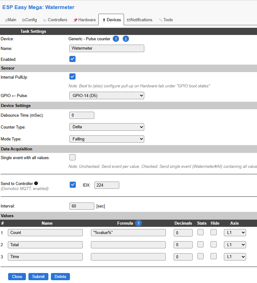 | Device | Generic Pulse Counter | Aantal pulsen tellen van wieltje in watermeter |