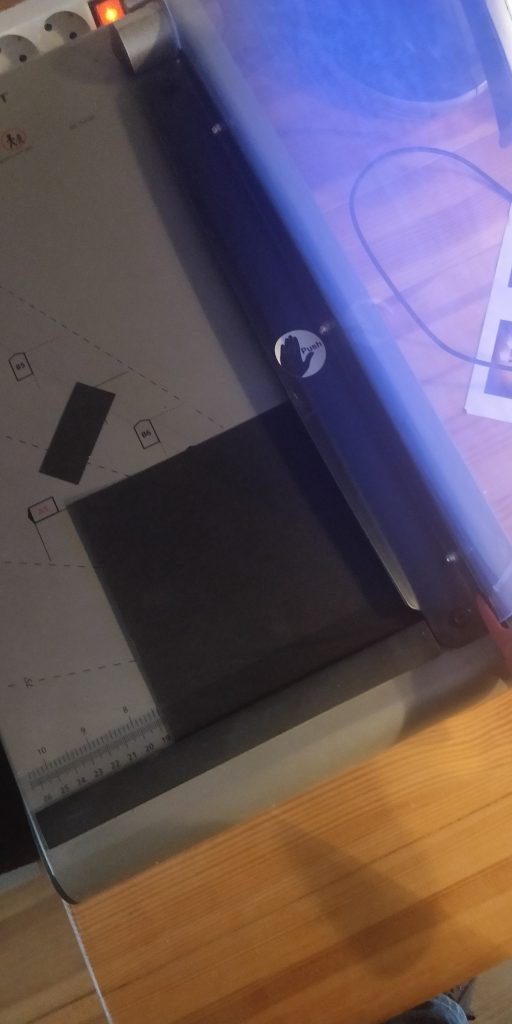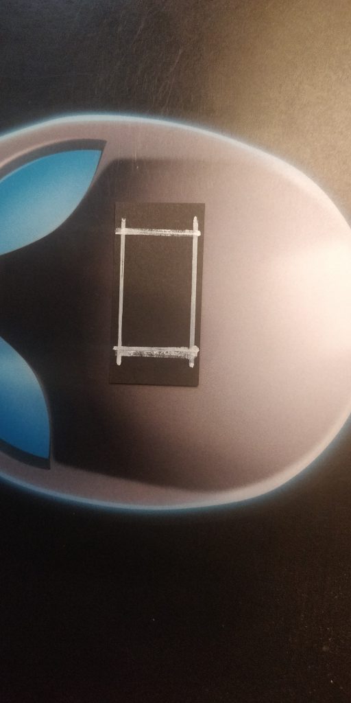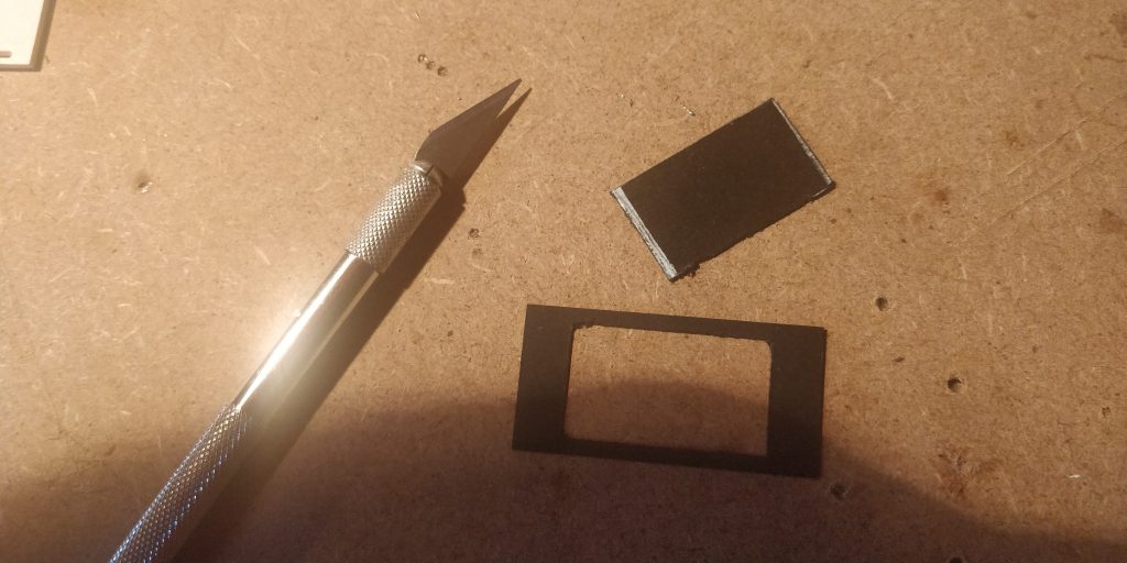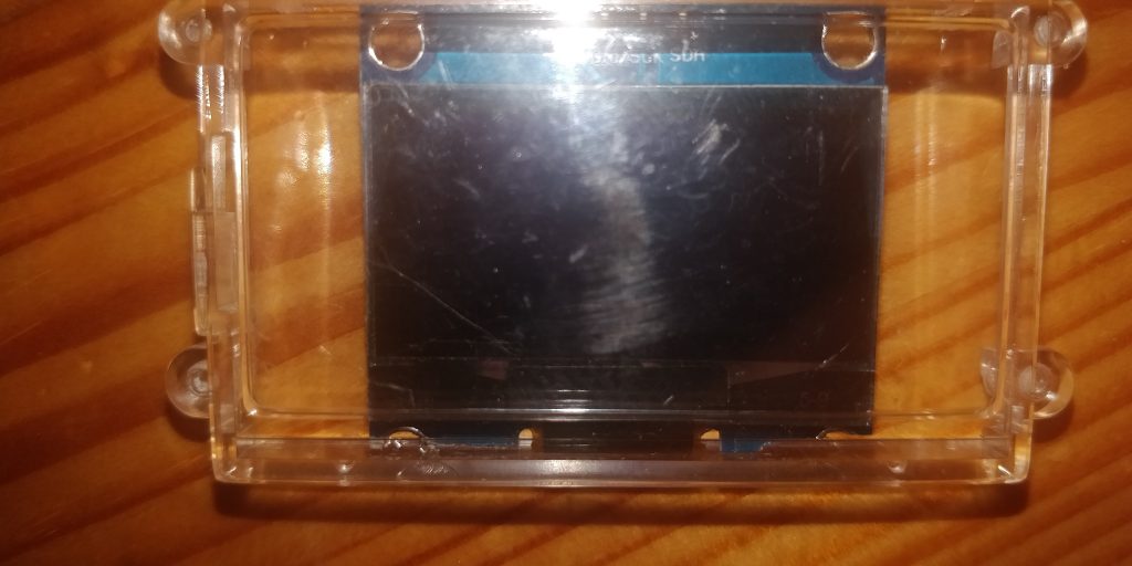 - Vervolgens de 1.3″ OLED display in het “glaasje” van de Danfoss thermostaat ingebouwd. Helaas was de OLED display die ik besteld had net een paar millimeter te hoog voor het glaasje. Geluk bij ongeluk was dat aan de bovenkant van de printplaat van de OLED display geen electronica zat, dus simpelweg met een kniptang een paar millimeter van de bovenkant geknipt om hem passend te maken voor het glaasje. Omdat de OLED display kleiner is dan het glaasje van een stukje zwart karton een passe partout gemaakt en in het glaasje gelegd. (De afmetingen van het passe partout zijn 24mm x 49mm, en de uitsnede is 18mm x 33mm. Dit gecentreerd in de passe partout levert een boven- en onderrand op van 3mm, en een linker en rechter rand van 8mm) Daarna in de oude printplaat met een kniptang een kleine inkeping gemaakt om ruimte te maken voor de aansluiting van de OLED display en jumperkabeltjes. Daarna het geheel in elkaar gezet en vastgeschroefd.