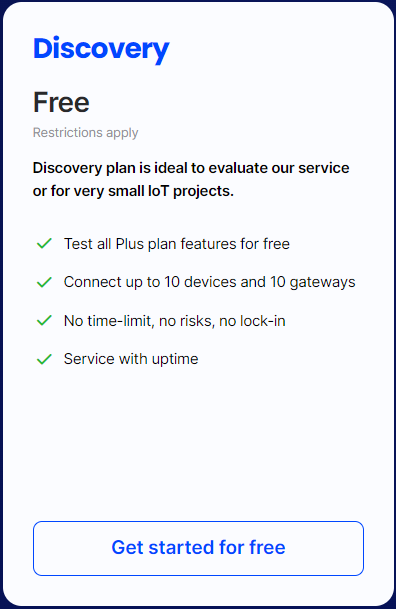 Maak eerst een account aan op TTN, navigeer in je browser naar https://www.thethingsindustries.com/stack/plans/, en kies voor het “pricing plan” Discovery, en klik op “Get started for free”