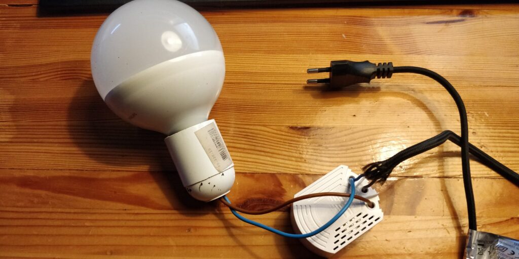 Proefopstelling gemaakt door een snoer met stekker aan te sluiten op de L-in en N aansluiting van de D1 dimmer, en een lamp op de L-out en N aansluiting.