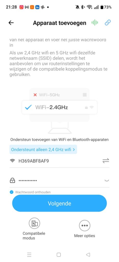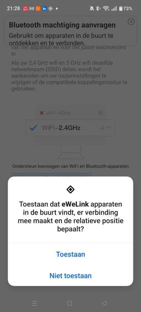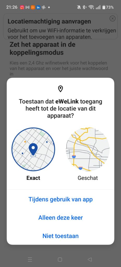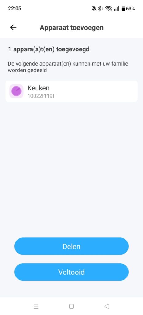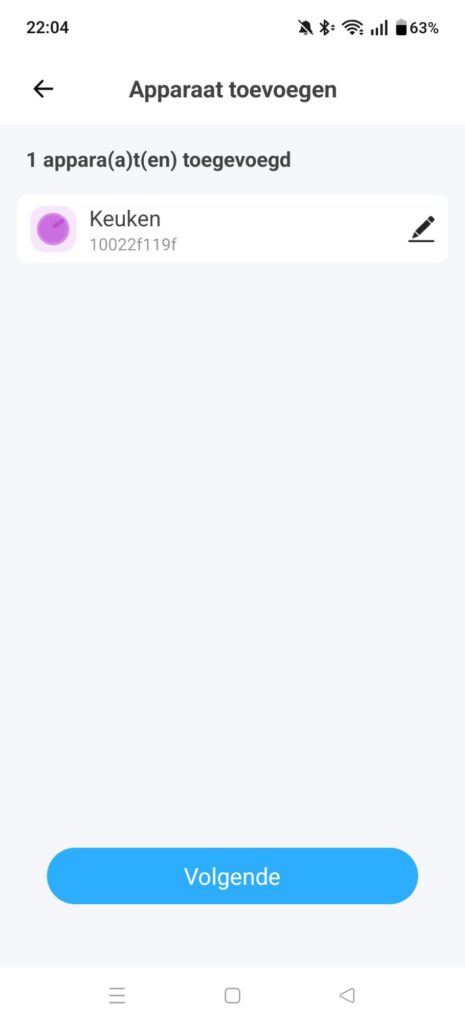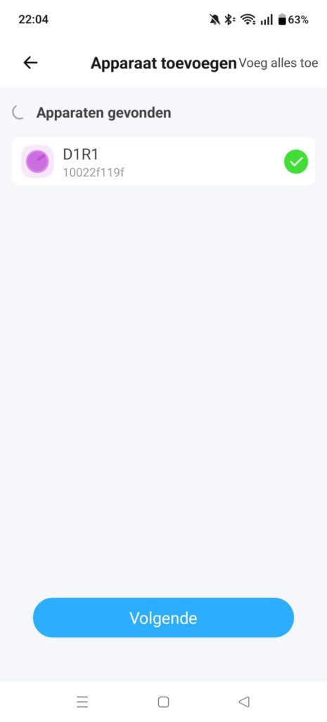 Installeer de eWeLink app op je telefoon, log in of creĆ«er een nieuw account. Nadat je ingelogd bent kom je op het startscherm. Klik op de + rechts bovenin om een nieuw apparaat toe te voegen, kies voor “Apparaat toevoegen”. Zorg dat je telefoon verbinding heeft met het 2.4Ghz WiFi netwerk en vul het SSID en wachtwoord van je WiFi in, vink voor toekomstig gebruik “Wachtwoord onthouden” aan en klik op “Volgende”. Zorg dat eWeLink de juiste bluetooth en locatie machtigingen krijgt. De eWeLink app gaat nu op zoek naar nieuwe apparaten. Stop de stekker van de D1 dimmer in het stopcontact, de dimmer gaat daarna direct in pairing mode en toont dat doormiddel van een pulserende lamp.