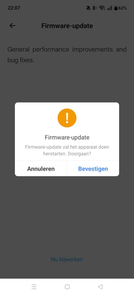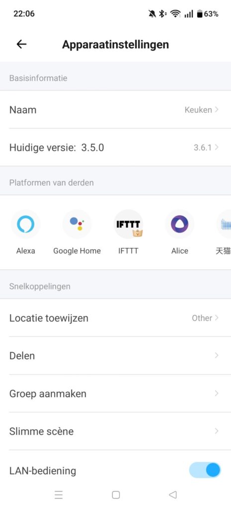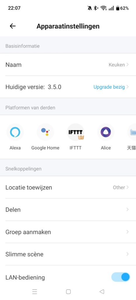 Nu gaan we de dimmer voorzien van de laatste firmware. Klik op de dimmer, en op het volgende scherm op de drie puntjes rechtsboven om de instellingen van de dimmer te openen. Hier lees je de huidige versie van de firmware terug en de laatst beschikbare, in mijn geval is de huidige versie 3.50 en de laatst beschikbare 3.61. Klik op het pijltje rechts van de laatst beschikbare versie bevestig het flashen met de nieuwste firmware door op “nu bijwerken” te klikken. Je keert terug in apparaatinstellingen waar je rechts van de firmware de voortgang kunt volgen. Dit duurt zo’n 30 seconden. Daarna scroll je helemaal onderaan in de apparaatinstellingen en klik op “Verwijderen”. Door de dimmer uit eWeLink te verwijderen wordt hij teruggezet naar de fabrieksinstellingen.